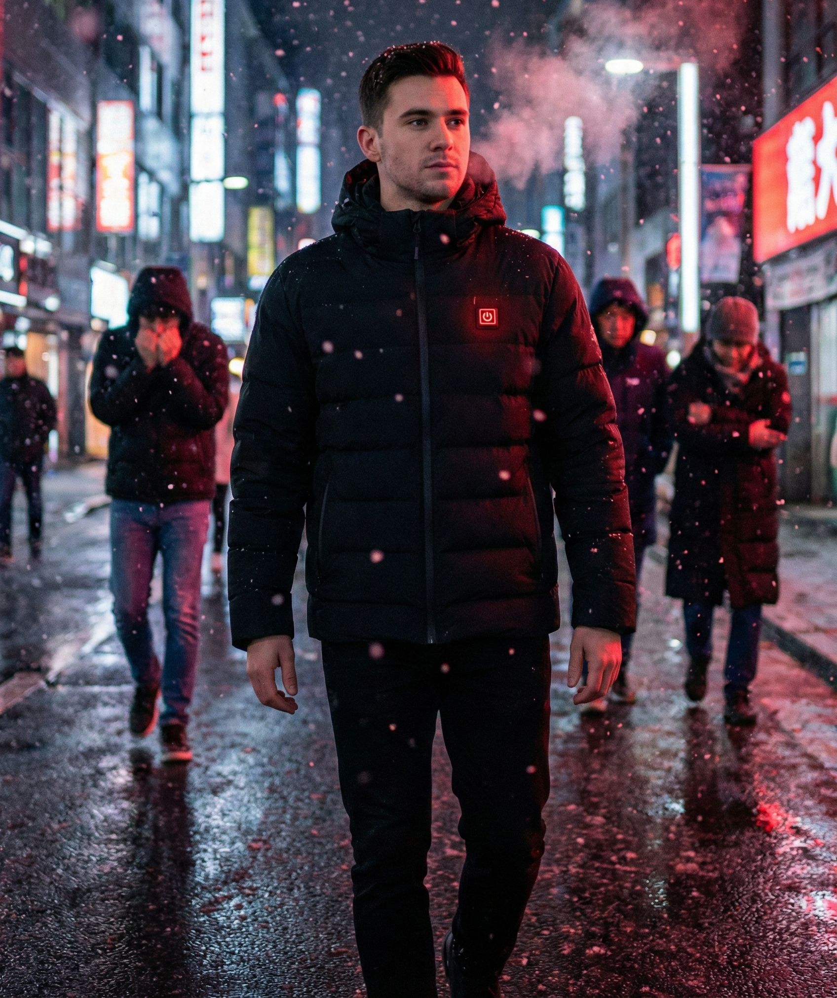 Basta strati ingombranti. La fibra di carbonio riscalda in pochi secondi e mantiene una temperatura costante esattamente dove serve (schiena e collo).